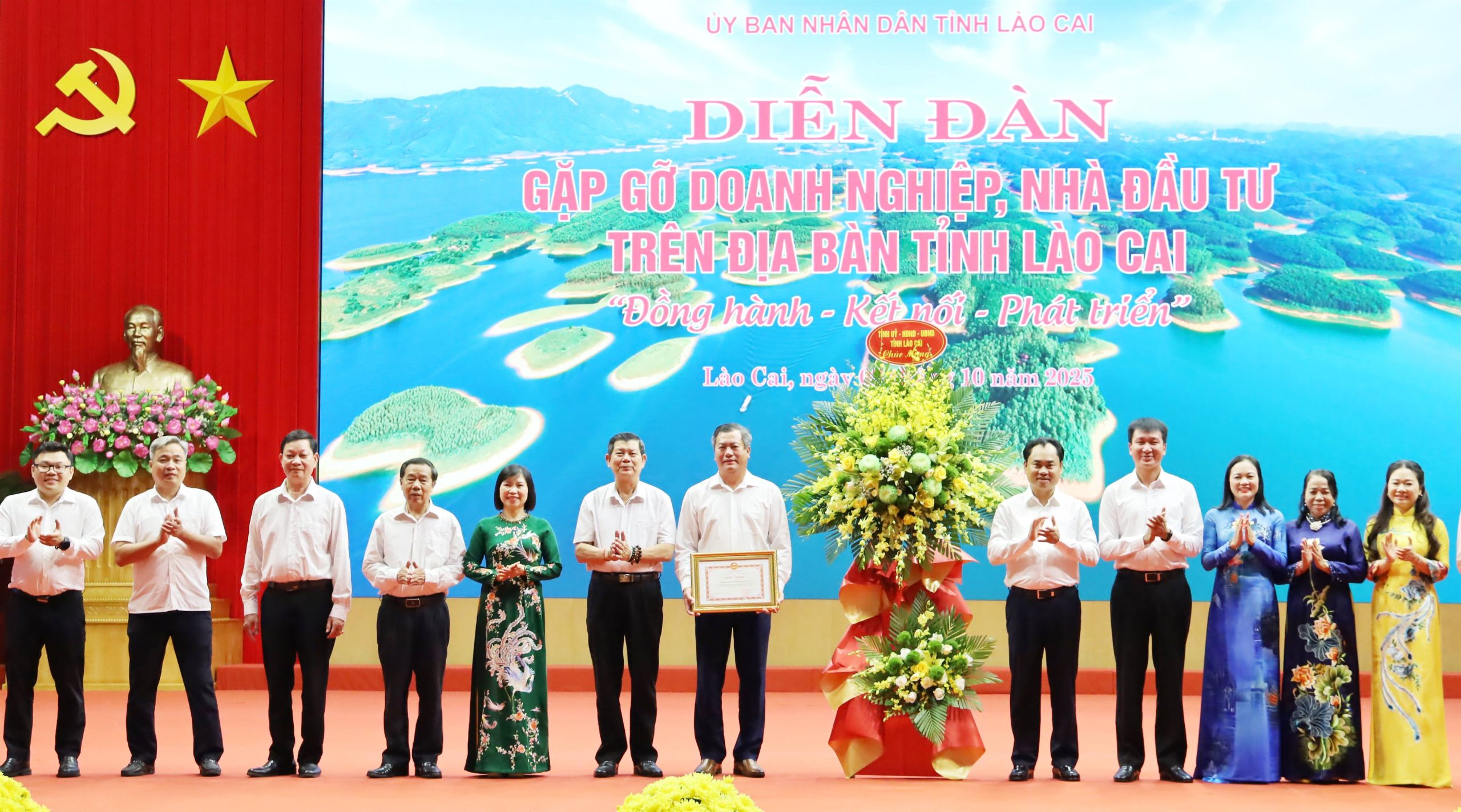 Đồng chí Trịnh Việt Hùng – Uỷ viên Dự khuyết BCH Trung ương Đảng, Bí thư Tỉnh uỷ, Chủ tịch HĐND tỉnh; đồng chí Trần Huy Tuấn – Phó Bí thư Tỉnh uỷ, Chủ tịch UBND tỉnh tặng hoa chúc mừng và tặng Bằng khen cho Hiệp hội doanh nghiệp tỉnh Lào Cai do đã có thành tích xuất sắc trong phong trào thi đua yêu nước và xây dựng tổ chức Hội nhân dịp kỷ niệm 21 năm Ngày Doanh nhân Việt Nam (13/10/2004 – 13/10/2025).